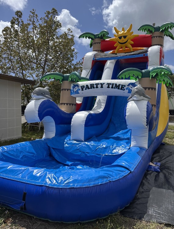 Make a splash with this 18' Single Lane Water Slide with Pool — a bright, palm‑and‑sun themed inflatable that brings a cool, high‑energy centerpiece to backyard parties, block events, and summer festivals. Riders climb a secure ladder, launch down a smooth single chute from a thrilling 18‑foot height, and finish in the attached shallow splash pool that gently slows guests for a safe exit. At 28' long and 11' wide, the compact footprint fits most yards while the tall slide delivers real speed and excitement for kids and teens. Constructed from durable, easy‑to‑clean vinyl with fun dolphin and palm tree accents, this slide is built for repeated use and eye‑catching curb appeal. Rent it when you want a showstopping, refreshing attraction that keeps guests entertained and cool on hot days.